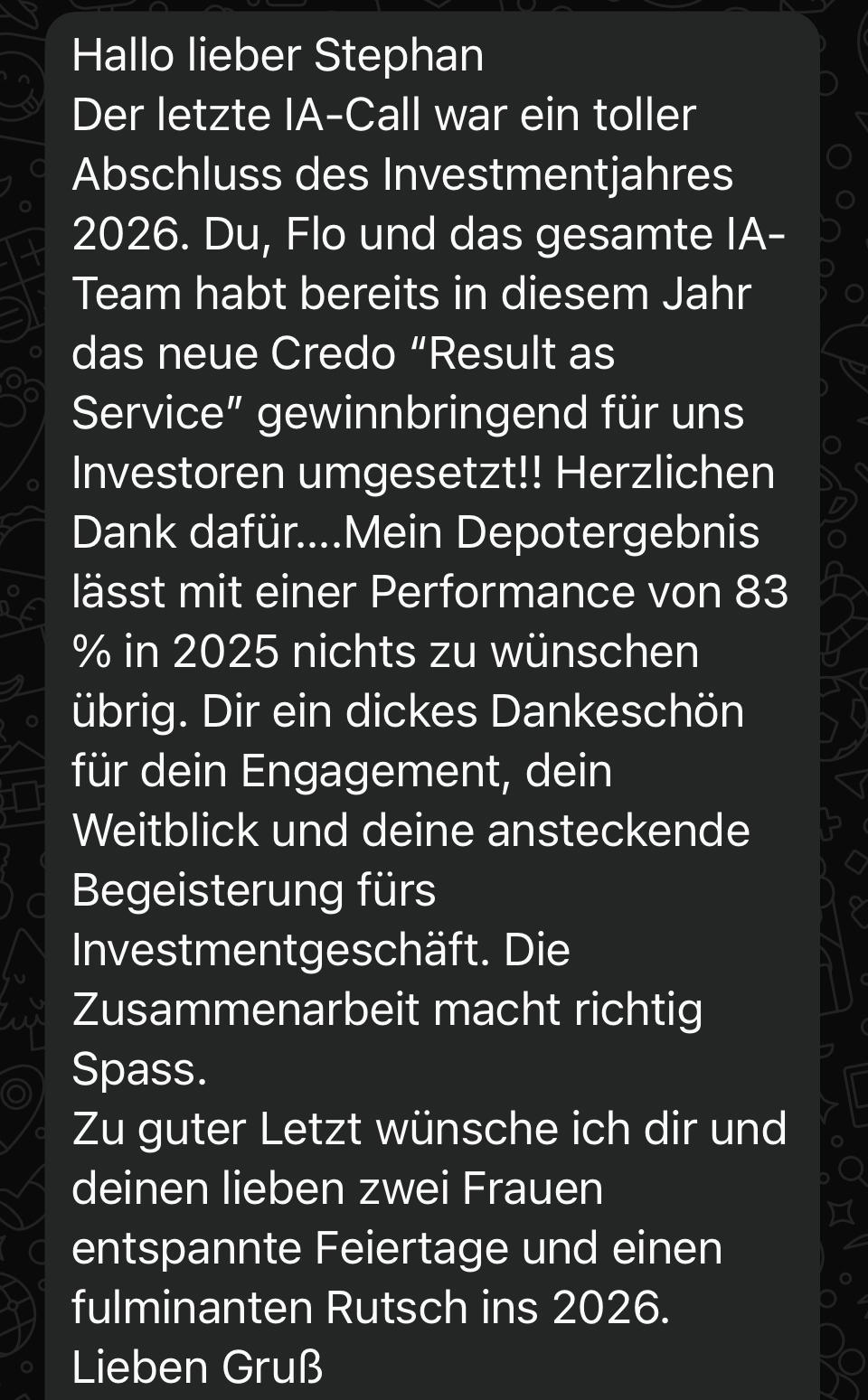 Disclaimer & Risikohinweis: Die dargestellten Inhalte und Kundenstimmen dienen ausschließlich Informationszwecken und stellen keine Anlageberatung, keine Anlageempfehlung, keine Finanzanalyse und keinen Finanzvertrieb dar. Die beschriebenen Erfahrungen und Ergebnisse beruhen auf individuellen Voraussetzungen und sind nicht repräsentativ; eine Garantie für ähnliche Resultate besteht nicht. Investitionen in Finanzmärkte sind mit erheblichen Risiken verbunden und können zum vollständigen Verlust des eingesetzten Kapitals führen. Vergangene Ergebnisse sind kein verlässlicher Indikator für zukünftige Entwicklungen