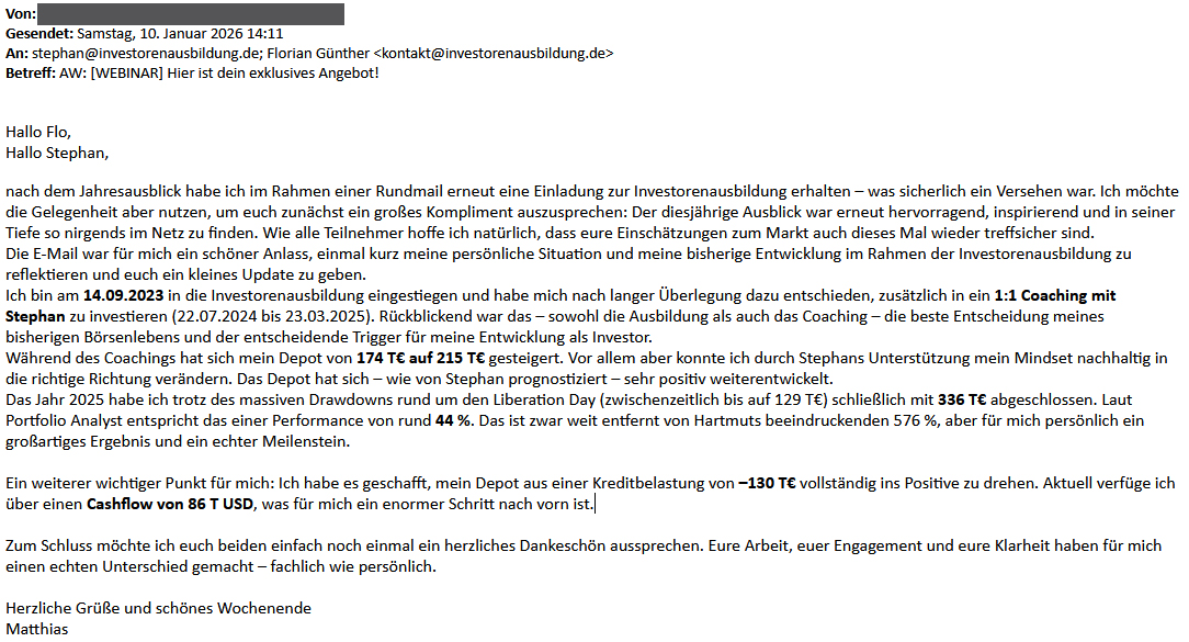 Die Investorenausbildung war für mich die beste Entscheidung, weil ich dort nicht nur Aktientipps bekomme, sondern von Anfang an gelernt habe, im Bereich Finanzen selbstständig zu agieren.